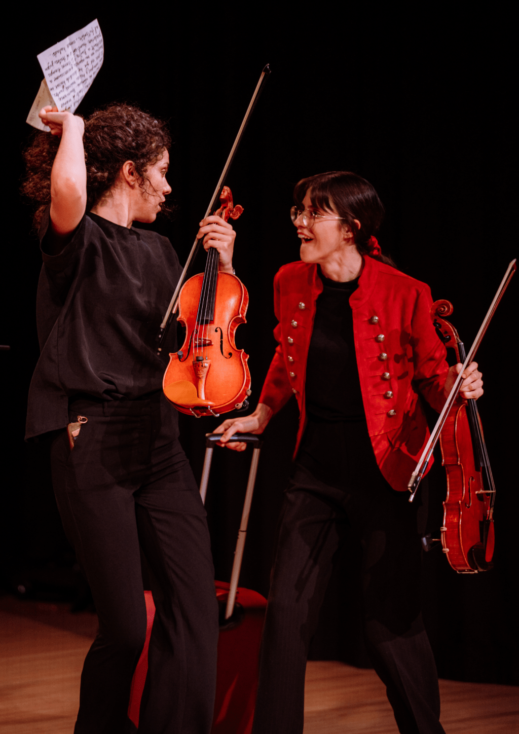Concierto didáctico a dúo en el que las intérpretes, de viaje con su misteriosa maleta, van dando voz a diferentes compositores y compositoras de la Historia de la Música, interaccionando a su vez con el joven público.